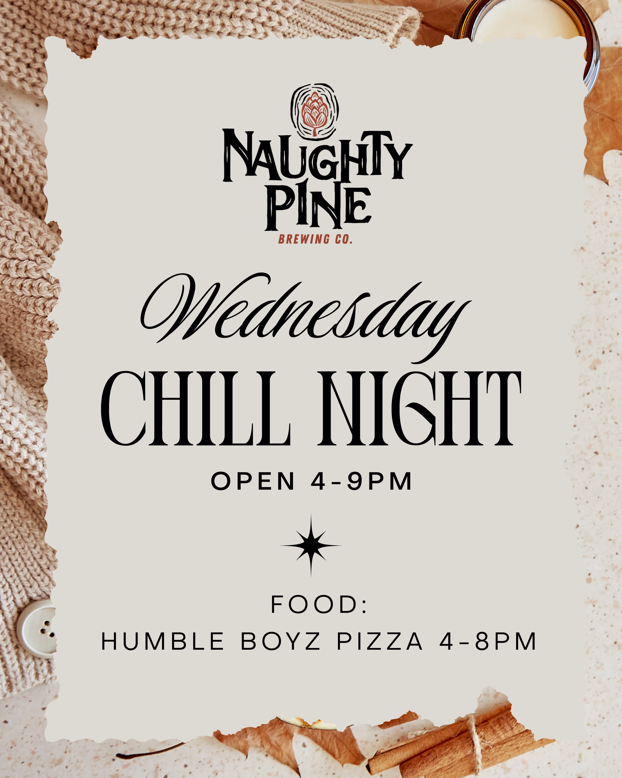 CHILL NIGHT Wednesday, November 26, 2025 4:00 PM 9:00 PM Naughty Pine Brewing Co. 766 Lakefield Dr., Ste A Westlake Village, CA 91361 United State of America (map) Google Calendar ICS